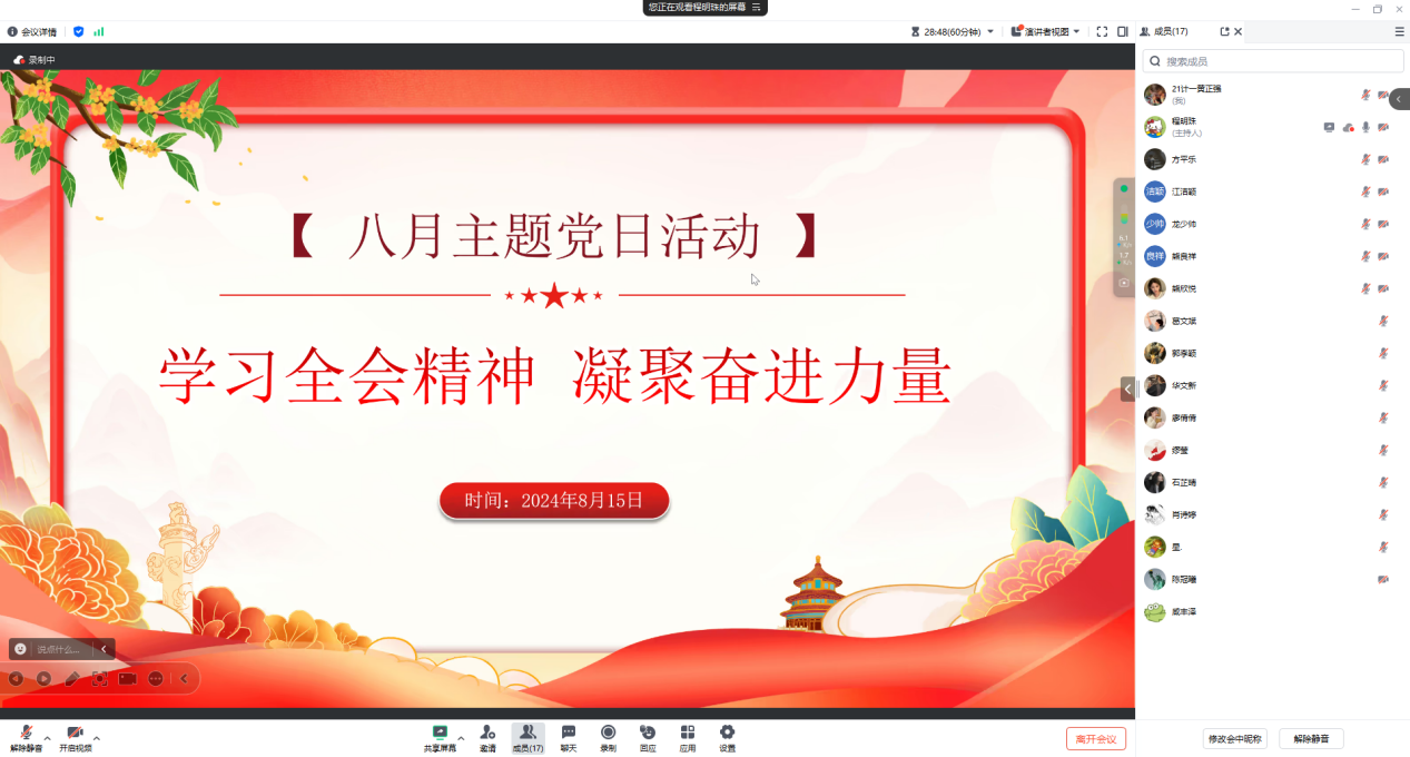 为深入学习贯彻党的二十届三中全会精神,感悟革命历史,强化爱国情怀和使命感,激励党员同志勇毅前行,争当先锋,今年会jinnianhuicom第二党支部于8月15日召开线上会议,开展了“学习全会精神 凝聚奋进力量”主题党日活动。