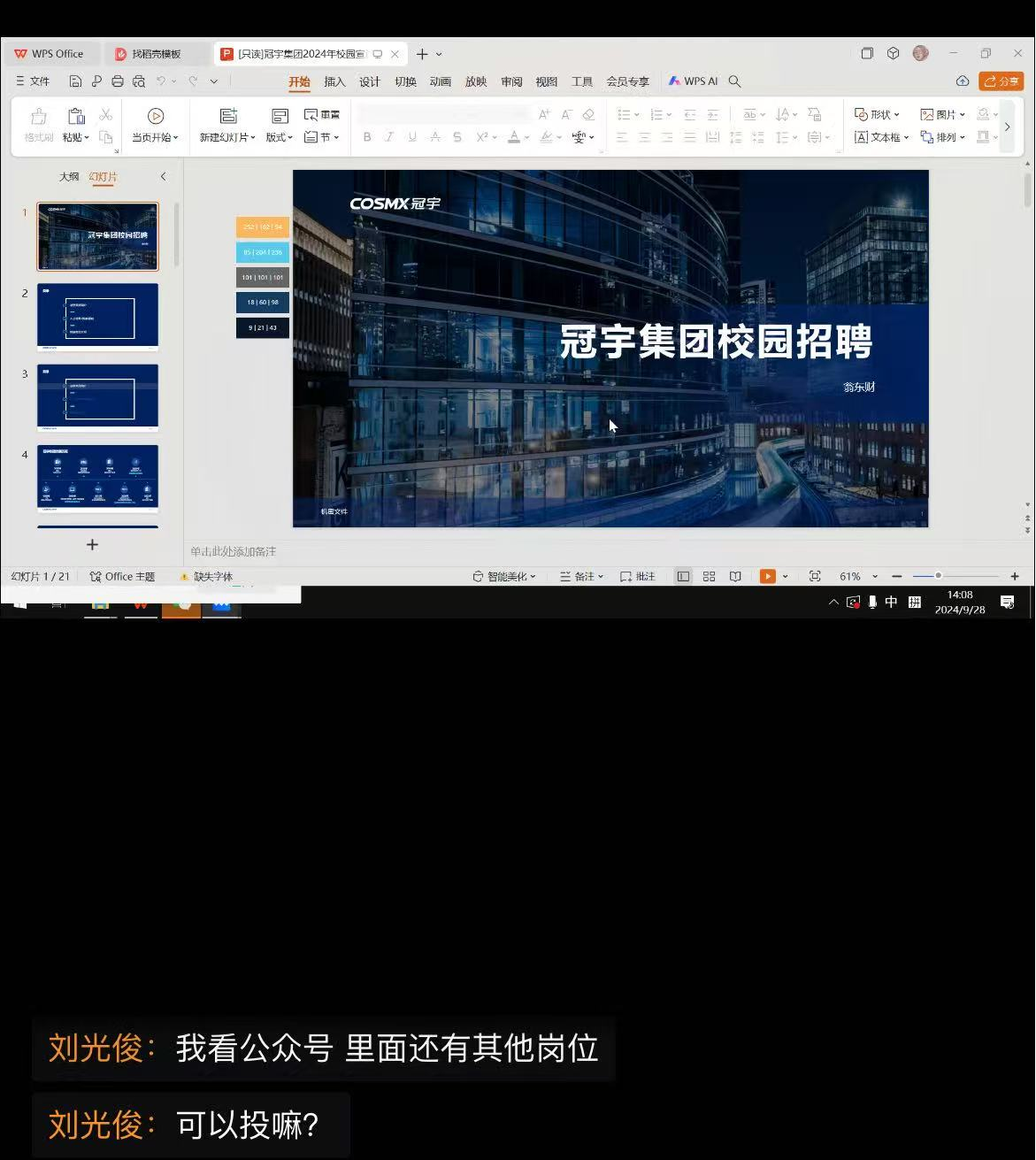 本次线上招聘会,冠宇集团针对今年会的专业特点,精心准备了一系列招聘岗位,这些岗位不仅涵盖了电子信息工程、计算机科学与技术、通信工程、软件工程等相关专业,还为毕业生们提供了广阔的发展空间和职业晋升机会。冠宇集团的招聘负责人详细介绍了公司的发展历程、企业文化、业务范围以及招聘岗位的具体要求。同时,他还分享了冠宇集团对应届毕业生的培养计划和薪酬福利体系。此外,冠宇集团还特别重视员工的职业发展,提供了技术通道和管理通道双重晋升机制,为员工的个人成长和职业发展提供了有力保障。