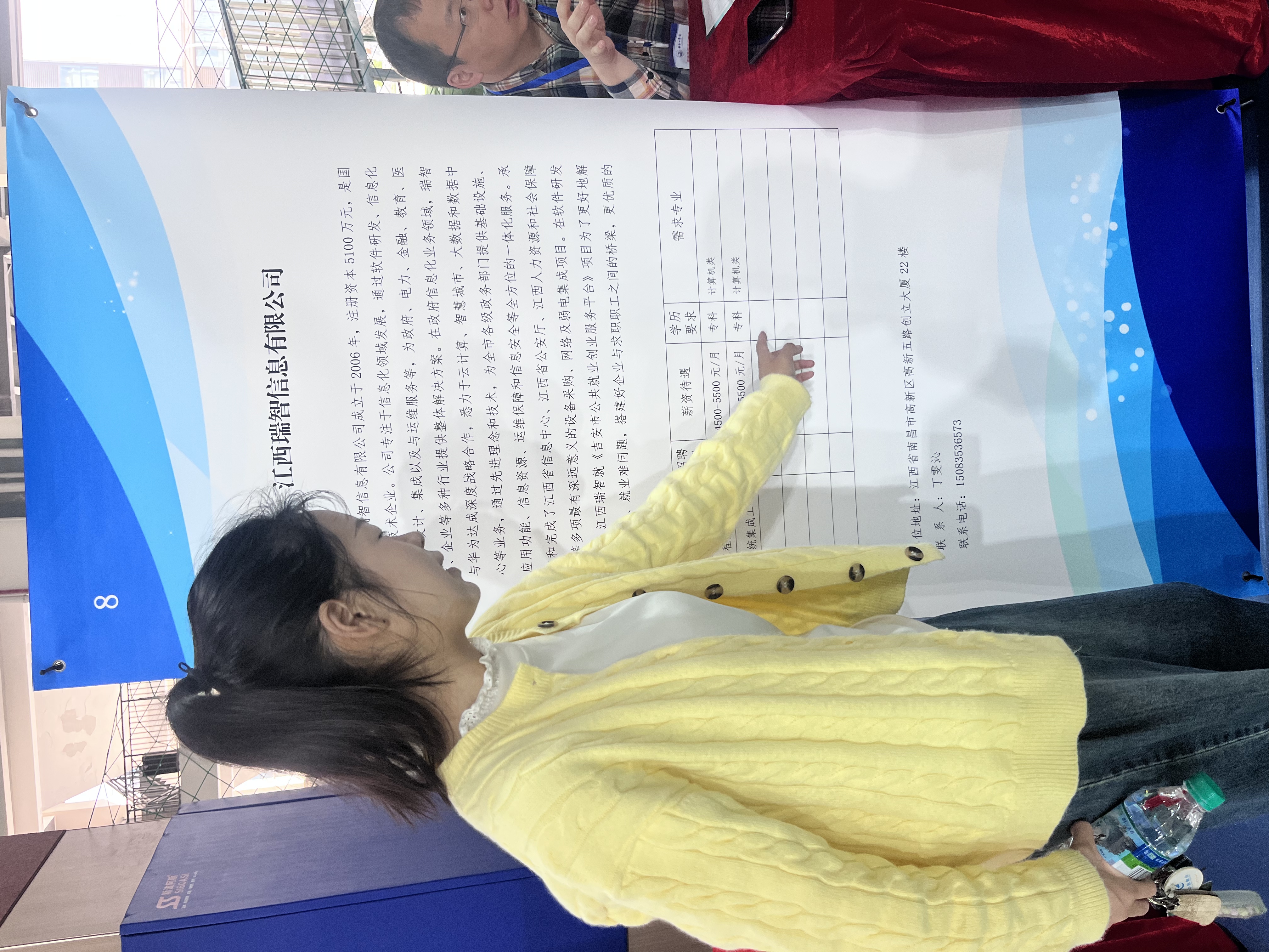 此次专场招聘会,岗位需求涵盖计算机科学与技术、电子信息工程、软件工程等多个专业,为2025届毕业生提供数百个就业岗位。黄金标先后与江西光明智能科技有限公司、江西聚梦实业有限公司、江西瑞智信息有限公司、江西研泰科技有限公司、江西微博有限公司等三十家企业进行深入洽谈。