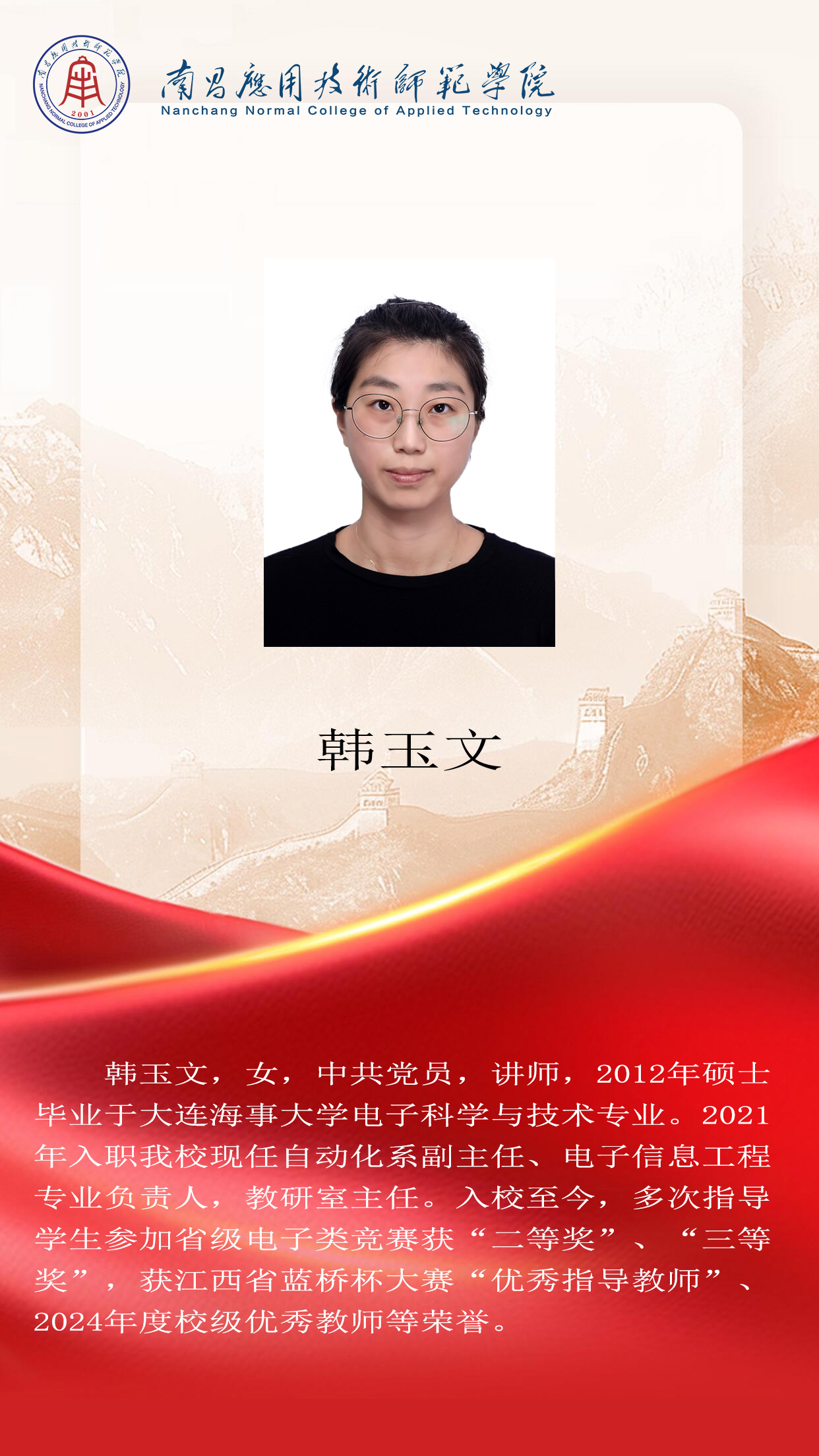 先进典型 优秀毕业生 优秀学生风采 优秀教职工 您现在的位置是:首页 > 先进典型 > 优秀教职工 韩文玉 优秀教师 管理员2025-06-161127 上一篇 曹璐 计算机系主任 下一篇 张扬 工程技术系主任