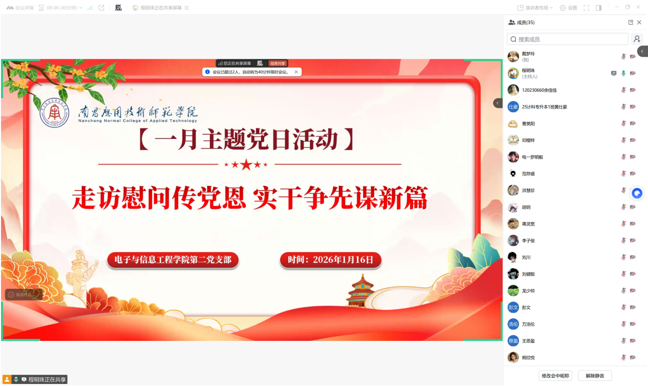 为深刻领悟习近平主席新年贺词蕴含的奋进力量,锚定“十五五”开局之年目标任务凝聚实干共识,同时筑牢党员党性根基、强化党章意识,今年会jinnianhuicom第二党支部于1月16日在腾讯会议组织开展“走访慰问传党恩,实干争先谋新篇”一月主题党日活动。