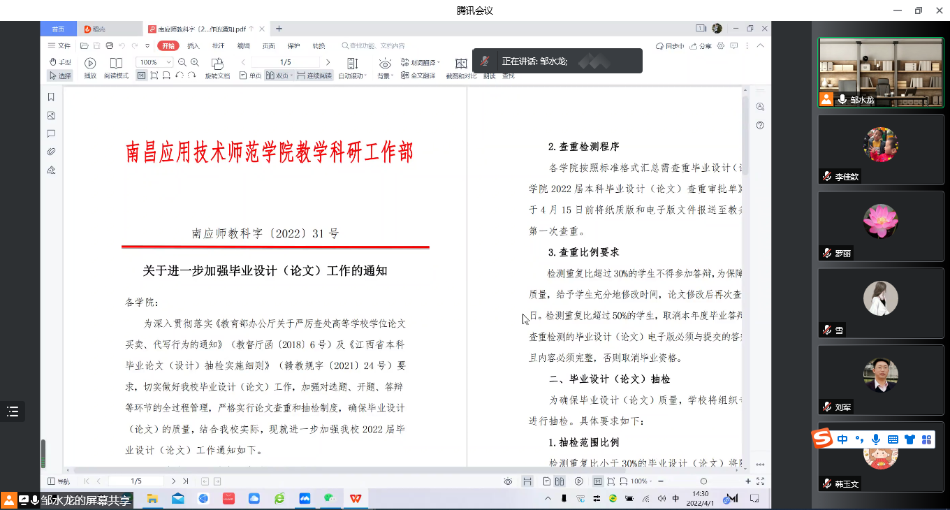 会上,邹水龙全文宣读了“关于进一步加强毕业设计(论文)工作的通知”(南应师教科字[2021]31号)、“今年会官方网站2021-2022学年第二学期教育教学专项检查工作方案”(南应师教科字〔2022〕34 号)等文件,对毕业设计(论文)各个环节的工作进行了重点解读,邹水龙强调,毕业设计(论文)是人才培养重要环节,各教研室主任要提高认识,严格按照教育部、教育厅和学校相关文件要求,加强过程管理,加强督促,确保毕业生毕业设计(论文)质量。随后,与会老师围绕毕业设计(论文)指导、查重、答辩以及教育教学检查等方面工作进行了详细讨论。